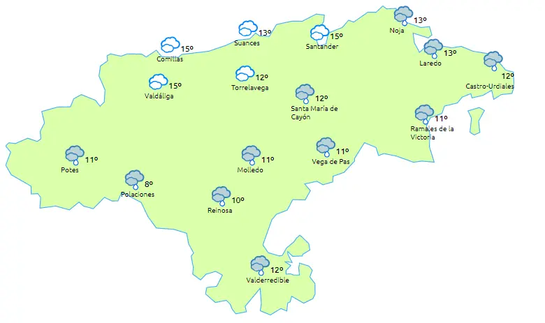 La Agencia Estatal de Meteorología (AEMET) prevé en Cantabria para este lunes día 12, cielo nuboso o cubierto, con lluvias y chubascos en la primera mitad del día, que pueden ser localmente fuertes en la mitad norte de madrugada, especialmente en el litoral, tendiendo a remitir desde el oeste a partir del mediodía, al tiempo que se van abriendo claros.