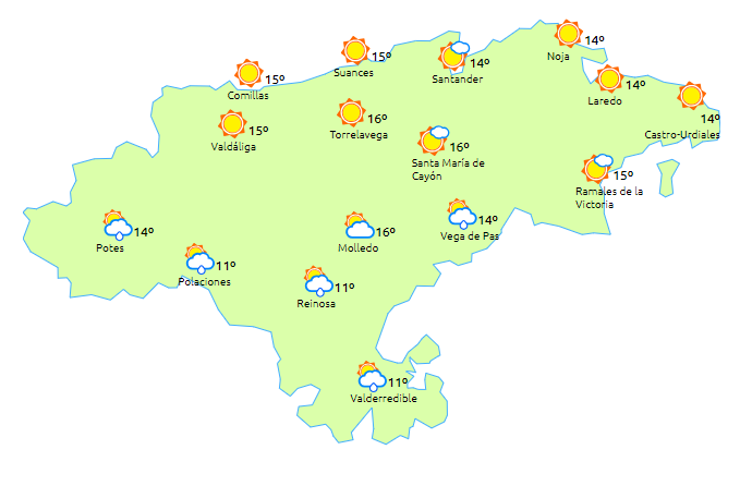 Temperaturas máximas y mínimas previstas: Cabezón de la Sal, 16 y 9 grados; San Vicente de la Barquera, 15 y 8; Santander, 16 y 10; Castro Urdiales, 16 y 8; Potes, 17 y 5; Reinosa, 13 y 3; y Torrelavega, 17 y 10 grados.