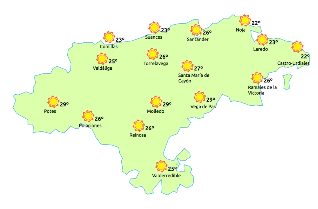Temperaturas máximas y mínimas previstas: Cabezón de la Sal, 27 y 16 grados; San Vicente de la Barquera, 23 y 15; Santander, 23 y 15; Castro Urdiales, 23 y 16; Potes, 32 y 15; Reinosa, 29 y 15; y Torrelavega, 27 y 15 grados.