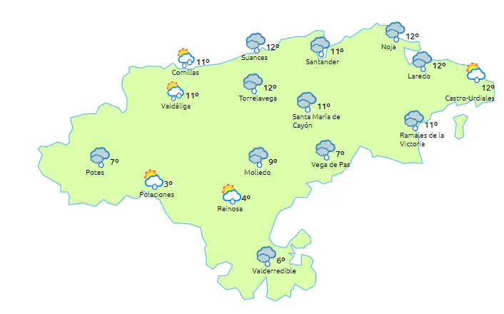 Temperaturas máximas y mínimas previstas: Cabezón de la Sal, 11 y 2 grados; San Vicente de la Barquera, 12 y 5; Santander, 12 y 6; Castro Urdiales, 13 y 6; Potes, 10 y -3; Reinosa, 6 y -7; y Torrelavega, 11 y 4 grados.