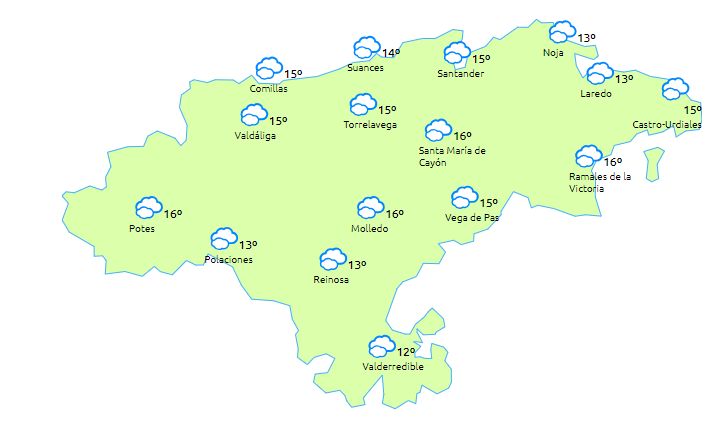 Temperaturas máximas y mínimas previstas: Cabezón de la Sal, 15 y 7 grados; San Vicente de la Barquera, 14 y 6; Santander, 15 y 8; Castro Urdiales, 15 y 8; Potes, 18 y 2; Reinosa, 14 y 0; y Torrelavega, 15 y 7 grados.