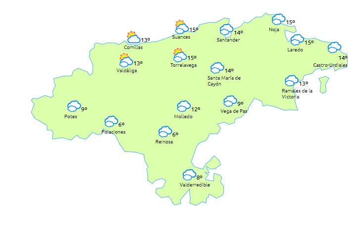 Temperaturas máximas y mínimas previstas: Cabezón de la Sal, 14 y 5 grados; San Vicente de la Barquera, 14 y 8; Santander, 15 y 8; Castro Urdiales, 15 y 7; Potes, 13 y 2; Reinosa, 6 y 0; y Torrelavega, 14 y 6 grados.