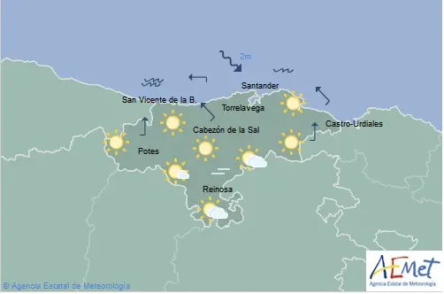 Temperaturas máximas y mínimas previstas: Cabezón de la Sal, 14 y 3 grados; San Vicente de la Barquera, 12 y 3; Santander, 13 y 6; Castro Urdiales, 12 y 6; Potes, 15 y -2; Reinosa, 11 y -3; y Torrelavega, 14 y 4 grados.