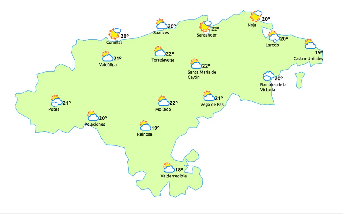 Temperaturas máximas y mínimas previstas: Cabezón de la Sal, 23 y 15 grados; San Vicente de la Barquera, 21 y 15; Santander, 21 y 15; Castro Urdiales, 20 y 15; Potes, 25 y 14; Reinosa, 22 y 8; y Torrelavega, 23 y 16 grados.