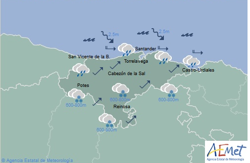 Temperaturas máximas y mínimas previstas: Cabezón de la Sal, 9 y 4 grados; San Vicente de la Barquera, 10 y 6; Santander, 11 y 7; Castro Urdiales, 10 y 7; Potes, 6 y 1; Reinosa, 3 y -2; y Torrelavega, 10 y 5 grados.