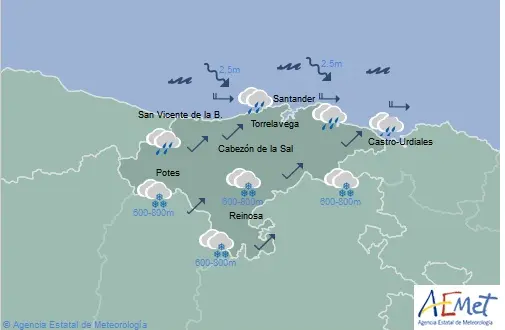 Temperaturas máximas y mínimas previstas: Cabezón de la Sal, 9 y 4 grados; San Vicente de la Barquera, 10 y 6; Santander, 11 y 7; Castro Urdiales, 10 y 7; Potes, 6 y 1; Reinosa, 3 y -2; y Torrelavega, 10 y 5 grados.