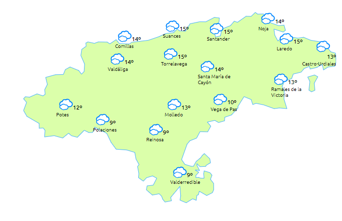 Temperaturas máximas y mínimas previstas: Cabezón de la Sal, 16 y 5 grados; San Vicente de la Barquera, 15 y 4; Santander, 16 y 7; Castro Urdiales, 16 y 6; Potes, 15 y 3; Reinosa, 10 y -2; y Torrelavega, 17 y 5 grados.