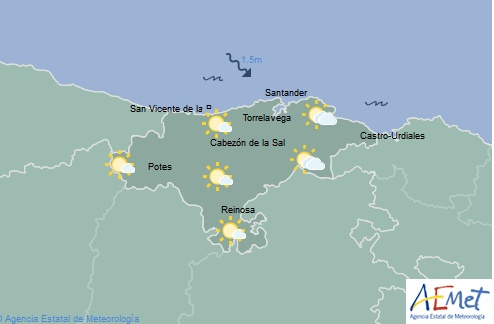 Temperaturas máximas y mínimas previstas: Cabezón de la Sal, 16 y 8 grados; San Vicente de la Barquera, 15 y 6; Santander, 15 y 7; Castro Urdiales, 15 y 6; Potes, 15 y 2; Reinosa, 13 y -3; y Torrelavega, 17 y 6 grados.