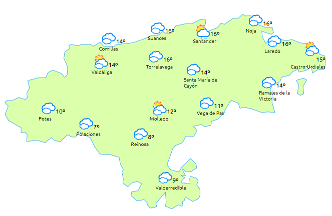 Temperaturas máximas y mínimas previstas: Cabezón de la Sal, 16 y 8 grados; San Vicente de la Barquera, 17 y 9; Santander, 16 y 11; Castro Urdiales, 16 y 11; Potes, 14 y 4; Reinosa, 9 y 2; y Torrelavega, 16 y 10 grados.