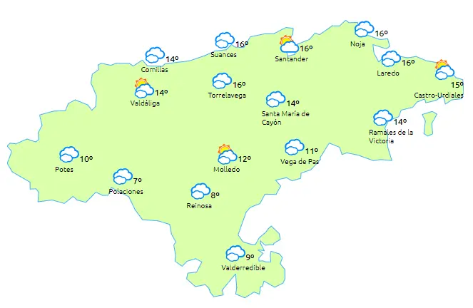 Temperaturas máximas y mínimas previstas: Cabezón de la Sal, 16 y 8 grados; San Vicente de la Barquera, 17 y 9; Santander, 16 y 11; Castro Urdiales, 16 y 11; Potes, 14 y 4; Reinosa, 9 y 2; y Torrelavega, 16 y 10 grados.