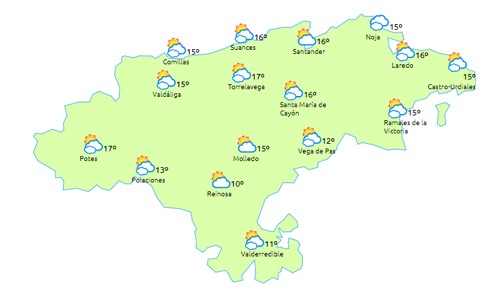 Temperaturas máximas y mínimas previstas: Cabezón de la Sal, 17 y 7 grados; San Vicente de la Barquera, 15 y 7; Santander, 17 y 11; Castro Urdiales, 17 y 11; Potes, 19 y 4; Reinosa, 11 y 1; y Torrelavega, 18 y 8 grados.