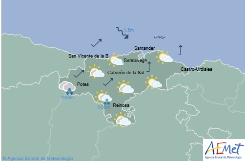 Temperaturas máximas y mínimas previstas: Cabezón de la Sal, 15 y 5 grados; San Vicente de la Barquera, 14 y 6; Santander, 15 y 8; Castro Urdiales, 14 y 6; Potes, 15 y 2; Reinosa, 11 y -3; y Torrelavega, 16 y 6 grados.