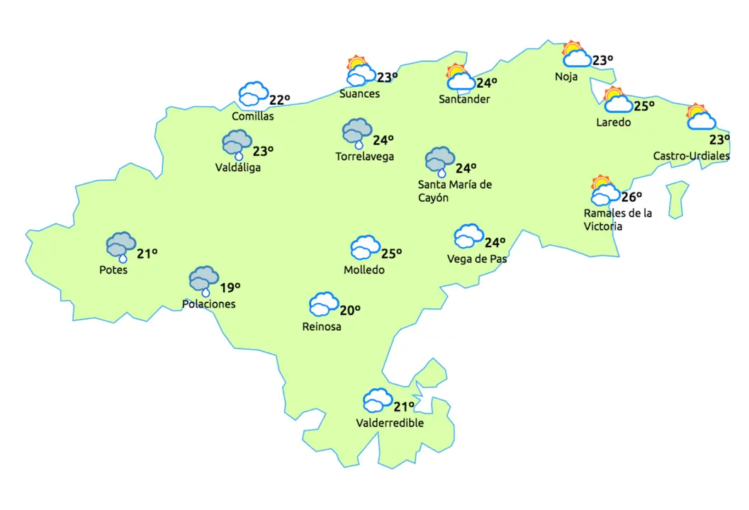 Temperaturas máximas y mínimas previstas: Cabezón de la Sal, 24 y 16 grados; San Vicente de la Barquera, 24 y 17; Santander, 24 y 19; Castro Urdiales, 24 y 19; Potes, 25 y 14; Reinosa, 23 y 11; y Torrelavega, 25 y 17 grados.