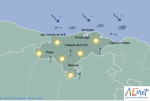 Temperaturas máximas y mínimas previstas: Cabezón de la Sal, 15 y 5 grados; San Vicente de la Barquera, 13 y 3; Santander, 14 y 5; Castro Urdiales, 14 y 3; Potes, 19 y 1; Reinosa, 15 y -2; y Torrelavega, 16 y 2 grados.