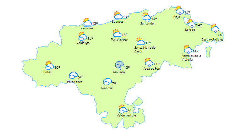 Temperaturas máximas y mínimas previstas: Cabezón de la Sal, 14 y 10 grados; San Vicente de la Barquera, 15 y 6; Santander, 15 y 9; Castro Urdiales, 16 y 4; Potes, 12 y 6; Reinosa, 8 y 0; y Torrelavega, 15 y 10 grados.