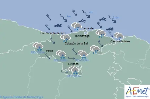 La Agencia Estatal de Meteorología (AEMET) prevé en Cantabria para este miércoles día 23, cubierto con precipitaciones localmente fuertes y persistentes. Cota de nieve entre 700-900 metros de madrugada aumentando a 900-1200 metros.