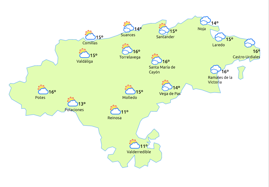 Temperaturas máximas y mínimas previstas: Cabezón de la Sal, 15 y 6 grados; San Vicente de la Barquera, 15 y 6; Santander, 15 y 8; Castro Urdiales, 16 y 6; Potes, 17 y 0; Reinosa, 12 y 2; y Torrelavega, 16 y 6 grados.