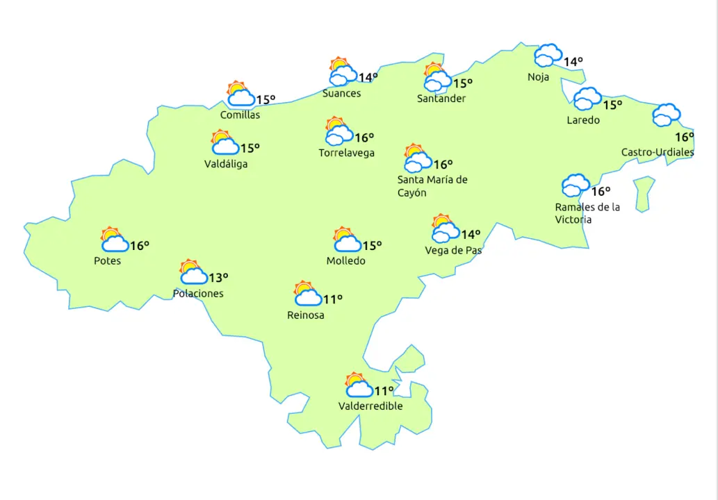 Temperaturas máximas y mínimas previstas: Cabezón de la Sal, 15 y 6 grados; San Vicente de la Barquera, 15 y 6; Santander, 15 y 8; Castro Urdiales, 16 y 6; Potes, 17 y 0; Reinosa, 12 y 2; y Torrelavega, 16 y 6 grados.