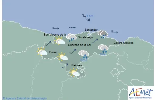 Temperaturas máximas y mínimas previstas: Cabezón de la Sal, 12 y 3 grados; San Vicente de la Barquera, 12 y 6; Santander, 13 y 7; Castro Urdiales, 13 y 8; Potes, 10 y -1; Reinosa, 5 y -5; y Torrelavega, 13 y 5 grados.