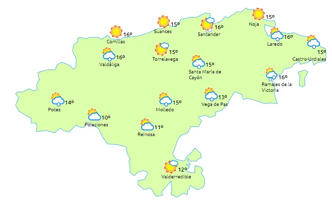 Temperaturas máximas y mínimas previstas: Cabezón de la Sal, 17 y 7 grados; San Vicente de la Barquera, 17 y 8; Santander, 17 y 9; Castro Urdiales, 18 y 9; Potes, 16 y 2; Reinosa, 12 y 1; y Torrelavega, 17 y 7 grados.