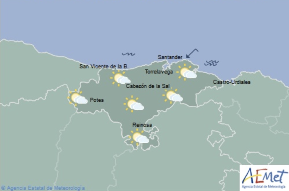 Temperaturas máximas y mínimas previstas: Cabezón de la Sal, 25 y 18 grados; San Vicente de la Barquera, 24 y 18; Santander, 25 y 20; Castro Urdiales, 24 y 18; Potes, 27 y 16; Reinosa, 25 y 9; y Torrelavega, 27 y 19 grados.