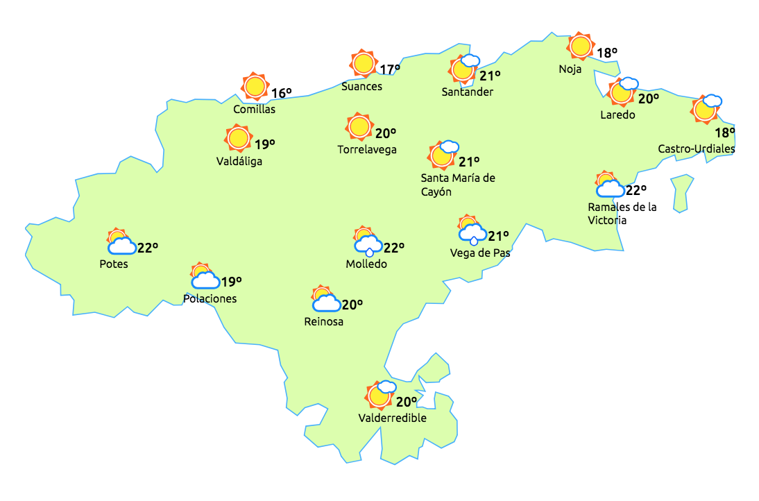 Temperaturas máximas y mínimas previstas: Cabezón de la Sal, 20 y 12 grados; San Vicente de la Barquera, 16 y 10; Santander, 18 y 11; Castro Urdiales, 18 y 10; Potes, 26 y 10; Reinosa, 22 y 8; y Torrelavega, 21 y 12 grados.
