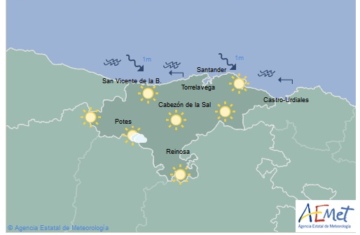 Temperaturas máximas y mínimas previstas: Cabezón de la Sal, 18 y 6 grados; San Vicente de la Barquera, 16 y 6; Santander, 17 y 7; Castro Urdiales, 16 y 5; Potes, 22 y 3; Reinosa, 19 y -1; y Torrelavega, 20 y 6 grados.
