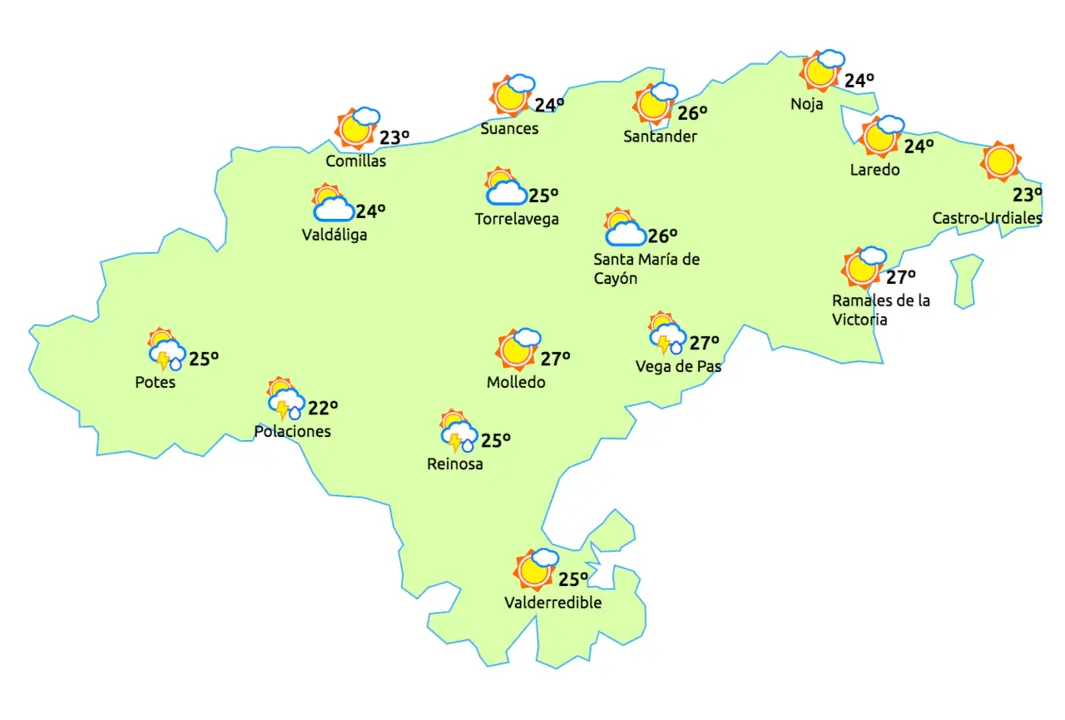 Temperaturas máximas y mínimas previstas: Cabezón de la Sal, 25 y 17 grados; San Vicente de la Barquera, 24 y 18; Santander, 25 y 18; Castro Urdiales, 24 y 17; Potes, 28 y 18; Reinosa, 26 y 13; y Torrelavega, 27 y 18 grados.