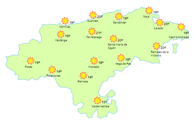 Temperaturas máximas y mínimas previstas: Cabezón de la Sal, 21 y 11 grados; San Vicente de la Barquera, 19 y 8; Santander, 20 y 10; Castro Urdiales, 19 y 10; Potes, 21 y 4; Reinosa, 14 y 3; y Torrelavega, 22 y 13 grados.