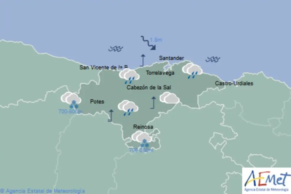 La Agencia Estatal de Meteorología (AEMET) prevé en Cantabria para mañana, día 19, cielo nuboso o cubierto con precipitaciones que se irán extendiendo de oeste a este a partir de mediodía. Cota de nieve entre 1.000 y 1.200 metros subiendo temporalmente a 1.800.