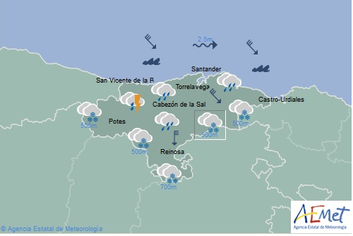 Temperaturas máximas y mínimas previstas: Cabezón de la Sal, 8 y 3 grados; San Vicente de la Barquera, 9 y 4; Santander, 10 y 6; Castro Urdiales, 10 y 6; Potes, 5 y 0; Reinosa, 2 y -2; y Torrelavega, 9 y 5 grados.