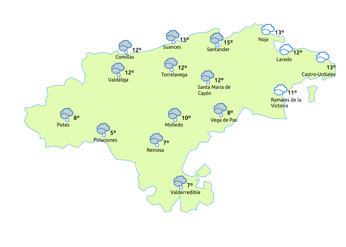 Temperaturas máximas y mínimas previstas: Cabezón de la Sal, 15 y 10 grados; San Vicente de la Barquera, 15 y 9; Santander, 17 y 10; Castro Urdiales, 16 y 10; Potes, 14 y 6; Reinosa, 8 y 3; y Torrelavega, 17 y 10 grados.