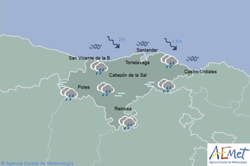 Temperaturas máximas y mínimas previstas: Cabezón de la Sal, 19 y 14 grados; San Vicente de la Barquera, 21 y 15; Santander, 21 y 16; Castro Urdiales, 20 y 16; Potes, 20 y 12; Reinosa, 16 y 9; y Torrelavega, 20 y 16 grados.