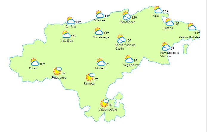 Temperaturas máximas y mínimas previstas: Cabezón de la Sal, 11 y 5 grados; San Vicente de la Barquera, 13 y 5; Santander, 13 y 8; Castro Urdiales, 13 y 7; Potes, 10 y -1; Reinosa, 7 y -1; y Torrelavega, 12 y 7 grados.