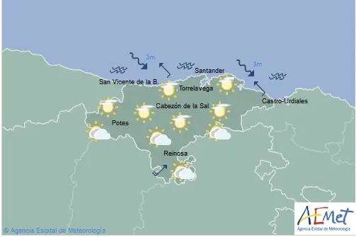Temperaturas máximas y mínimas previstas: Cabezón de la Sal, 17 y 5 grados; San Vicente de la Barquera, 15 y 7; Santander, 16 y 9; Castro Urdiales, 16 y 7; Potes, 14 y 4; Reinosa, 8 y 1; y Torrelavega, 19 y 7 grados.