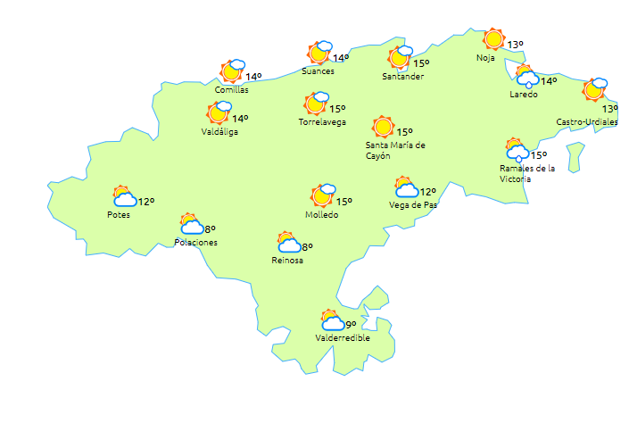 Temperaturas máximas y mínimas previstas: Cabezón de la Sal, 15 y 7 grados; San Vicente de la Barquera, 14 y 6; Santander, 16 y 9; Castro Urdiales, 16 y 8; Potes, 13 y 5; Reinosa, 7 y 2; y Torrelavega, 16 y 7 grados.