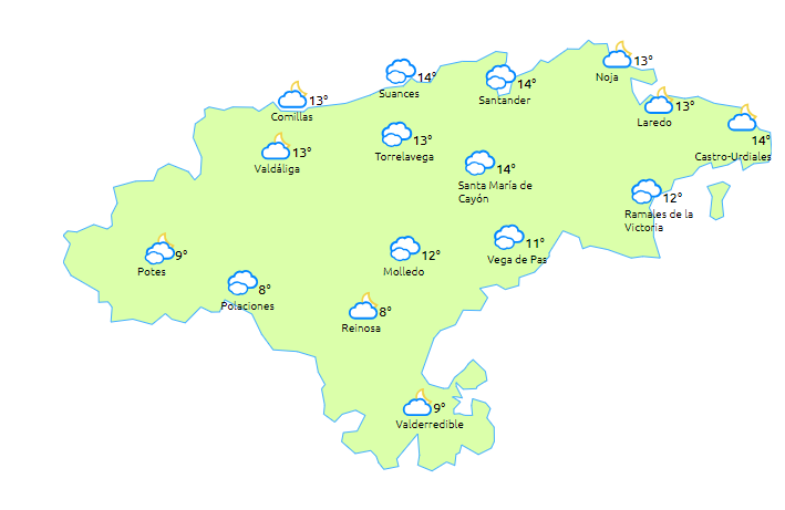 Temperaturas máximas y mínimas previstas: Cabezón de la Sal, 17 y 6 grados; San Vicente de la Barquera, 17 y 7; Santander, 18 y 9; Castro Urdiales, 18 y 9; Potes, 19 y 2; Reinosa, 13 y 2; y Torrelavega, 17 y 9 grados.