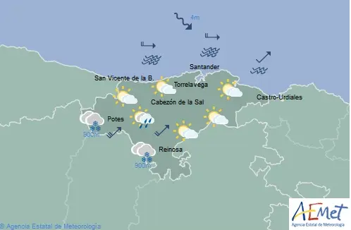 Temperaturas máximas y mínimas previstas: Cabezón de la Sal, 12 y 5 grados; San Vicente de la Barquera, 11 y 5; Santander, 12 y 7; Castro Urdiales, 13 y 7; Potes, 9 y 2; Reinosa, 6 y -1; y Torrelavega, 13 y 6 grados.