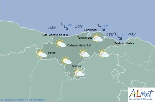 Temperaturas máximas y mínimas previstas: Cabezón de la Sal, 16 y 7 grados; San Vicente de la Barquera, 14 y 8; Santander, 16 y 8; Castro Urdiales, 14 y 8; Potes, 19 y 4; Reinosa, 14 y 1; y Torrelavega, 17 y 6 grados.