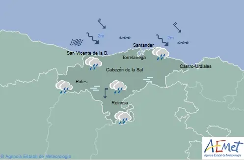 Temperaturas máximas y mínimas previstas: Cabezón de la Sal, 12 y 8 grados; San Vicente de la Barquera, 13 y 10; Santander, 13 y 10; Castro Urdiales, 13 y 10; Potes, 10 y 4; Reinosa, 7 y 3; y Torrelavega, 13 y 9 grados.
