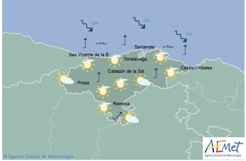 Temperaturas máximas y mínimas previstas: Cabezón de la Sal, 16 y 6 grados; San Vicente de la Barquera, 15 y 6; Santander, 16 y 7; Castro Urdiales, 15 y 7; Potes, 14 y 1; Reinosa, 10 y -1; y Torrelavega, 16 y 6 grados.