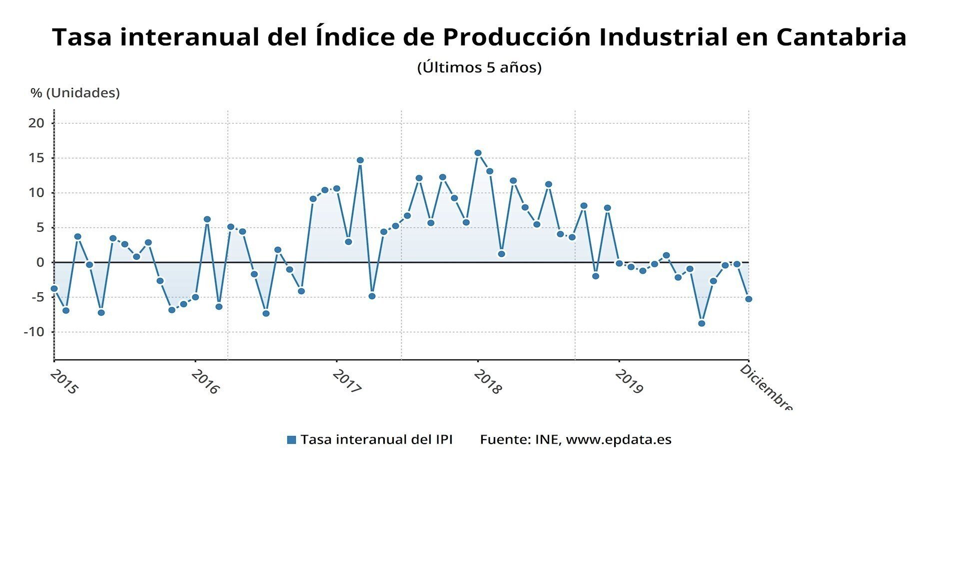 Por otra parte, el pasado diciembre, la producción industrial cayó un 5,3% en Cantabria respecto al mismo mes de 2018, el tercer descenso más fuerte tras los de Andalucía (-8,8%) y Asturias (-8%). En el conjunto del país, el IPI creció un 1,7%.