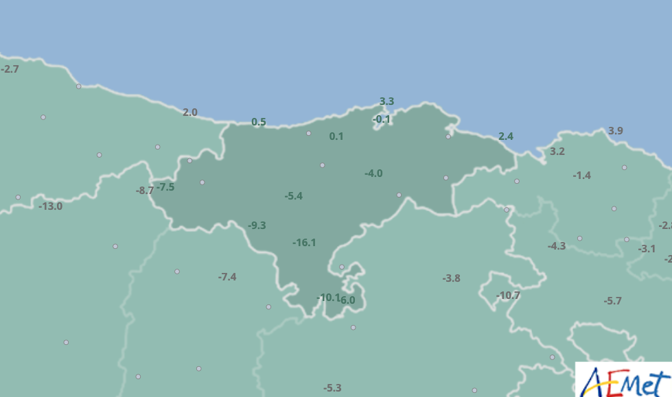 Por otros lugares de Cantabria, en Alto Campoo se registran -9,3 grados, en Polientes -6, en Camaleño -7,5 grados, en Los Tojos -5,4 grados, en Villacarriedo -4, en Torrelavega 0.1 grados y en Santander 3,3 grados.