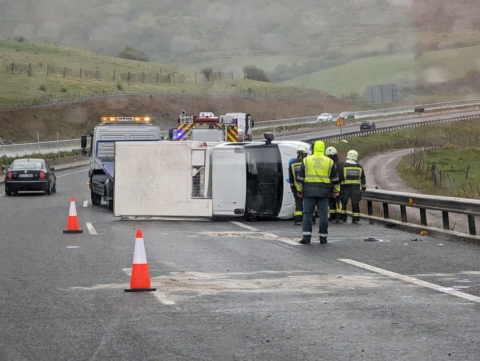 El segundo, un accidente en la autovía a su paso por Cañeda provoca ligeras retenciones en sentido Santander, el carril derecho se encuentra cortado por el vuelco de un vehículo de reparto de alimentación.