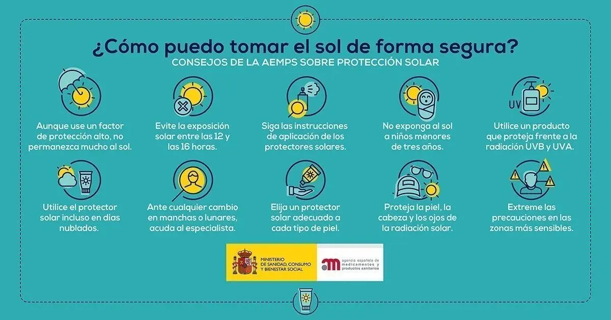 La Agencia Española de Medicamentos y Productos Sanitarios (AEMPS), dependiente del Ministerio de Sanidad, Consumo y Bienestar Social, ha publicado un decálogo de recomendaciones generales que busca promover cómo tomar el solar de forma segura y fomentar el buen uso de las cremas protectoras, entre los que se encuentran no permanecer mucho tiempo al sol a pesar de usar un factor de protección alto o no exponer a los niños menores de tres años.