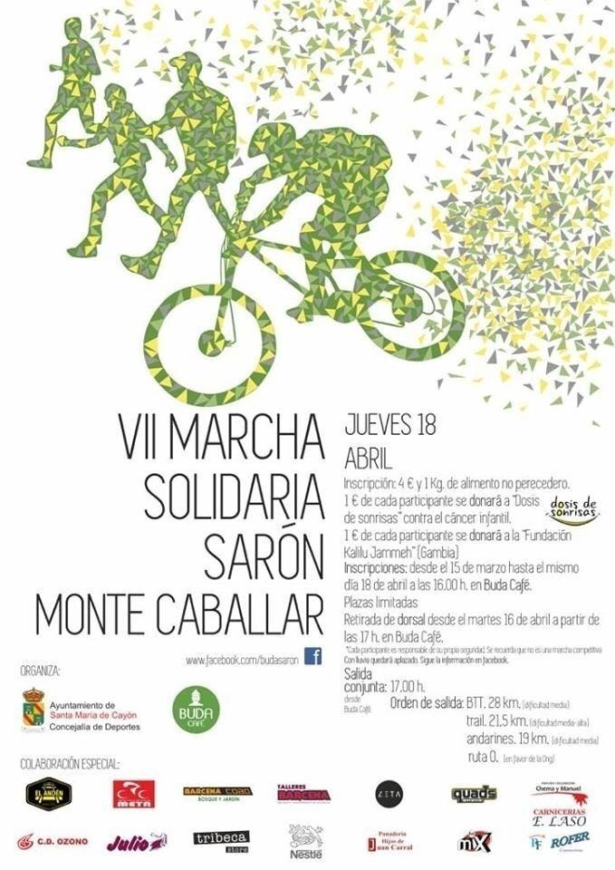 Sarón pone en marcha una nueva edición de la Marcha Solidaria Sarón Monte Caballar, un evento organizado por el Ayuntamiento de Santa María de Cayón y Buda Café. El objetivo del proyecto es conseguir donaciones para ayudar a la organización “Dosis de sonrisas” y a “Fundación Kalilu Jammeh”, así como al banco de alimentos del ayuntamiento de Santa María de Cayón. El jueves 18 de abril se dará la salida conjunta a las 17.00 horas desde Buda Café.