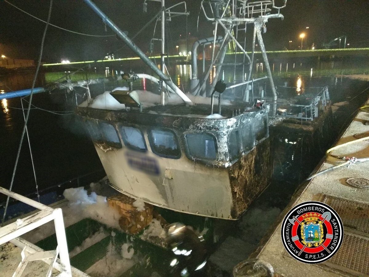 Los bomberos atacaron el fuego de la embarcación, con bandera de Santander, primero desde el exterior y después a bordo, mientras Salvamento Marítimo coordinó las labores de contención de derrame del combustible.