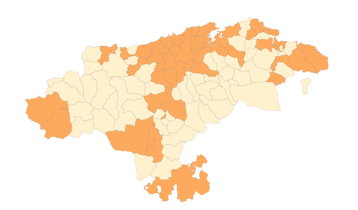 Un total de 47 municipios de Cantabria se sitúan esta semana en naranja (nivel 2) en el mapa de riesgo por Covid-19, 11 más que la semana pasada, debido a la tendencia creciente en el nivel de incidencia que registra la región.