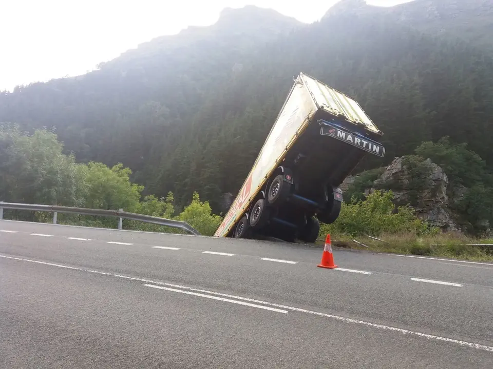 Un camión que se desplazaba por las 'hoces de bárcena' sentido Reinosa ha perdido la caja y la situación, pese al riesgo que conllevó, ha quedado en un susto. Ni el chófer ni ningún otro usuario de la carretera nacional 611 ha sufrido daño alguno. 'La quinta rueda' ha fallado y el remolque ha recorrido varios metros por la inercia hasta quedar colgado al río tal como se ve en las imágenes.
