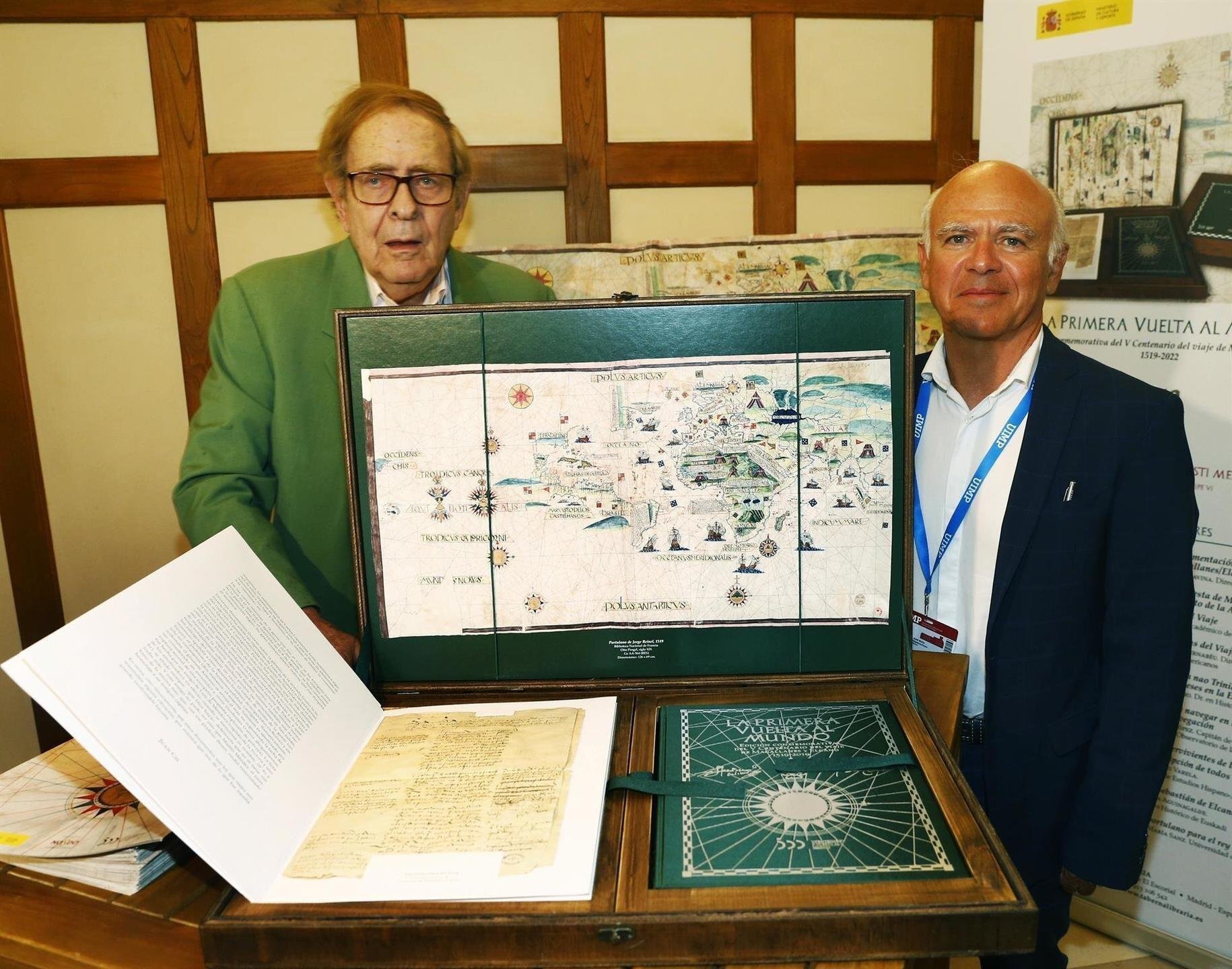 El catedrático y miembro de la Real Academia de Ciencias Morales y Políticas, Ramón Tamames y el doctor en Historia de la Cartografía de la Universidad de Salamanca, José María Sanz Hermida, han presentado este martes el libro 'La Primera Vuelta al Mundo. Edición conmemorativa del V Centenario 1519-2022' (Taberna Libraria) que contiene las dos únicas cartas autógrafas de Magallanes y Elcano, dirigidas al rey Carlos I, así como el Portulano de Jorge Reinel.